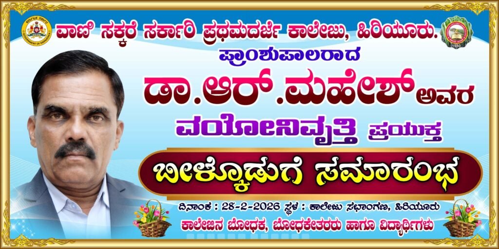 ನಗರದ ವಾಣಿ ಸಕ್ಕರೆ ಸರ್ಕಾರಿ ಪ್ರಥಮ ದರ್ಜೆ ಕಾಲೇಜಿನ ಆವರಣದಲ್ಲಿ ಕಾಲೇಜಿನ ಪ್ರಾಂಶುಪಾಲರಾದ ಡಾ.ಆರ್.ಮಹೇಶ್ ರವರ ವಯೋನಿವೃತ್ತಿ ಪ್ರಯುಕ್ತ ಫೆಬ್ರವರಿ 28 ರ ಶನಿವಾರದಂದು ಬೀಳ್ಕೊಡುಗೆ ಸಮಾರಂಭವನ್ನು ಹಮ್ಮಿಕೊಳ್ಳಲಾಗಿದೆ ಎಂಬುದಾಗಿ ಕಾಲೇಜಿನ ಆಡಳಿತ ಮಂಡಳಿ ಮಾಧ್ಯಮಗಳಿಗೆ ಮಾಹಿತಿ ನೀಡಿದೆ.