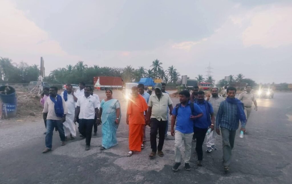 ಮಾದಿಗರಿಗೆ ಒಳಮೀಸಲಾತಿ ಜಾರಿಗೆ ಒತ್ತಾಯಿಸಿ ನಡೆಯುತ್ತಿರುವ ಪಾದಯಾತ್ರೆ ಸೋಮವಾರ ಸಂಜೆ ಹಿರಿಯೂರು ತಲುಪಿದ ಸಂದರ್ಭದಲ್ಲಿ ಸಂವಿಧಾನ ಶಿಲ್ಪಿ ಡಾಕ್ಟರ್ ಬಿ.ಆರ್.ಅಂಬೇಡ್ಕರ್ ಪ್ರತಿಮೆ ಮಾಲಾರ್ಪಣೆ ಮಾಡಿ ನಗರದ ಮುಖ್ಯರಸ್ತೆಯಲ್ಲಿ ನೂರಾರು ಜನರ ಜೊತೆ ಹೆಜ್ಜೆ ಹಾಕಿದ ಶ್ರೀಗಳು ನಗರದ ಹೃದಯ ಭಾಗದಲ್ಲಿರುವ ಚಮ್ಮಾರಿಕೆ ಅಂಗಡಿಗೆ ಭೇಟಿ ನೀಡಿ, ಚಪ್ಪಲಿ ರಿಪೇರಿ ಮಾಡುವ ಮೂಲಕ ಸರ್ಕಾರದ ನಿರ್ಧಾರದ ವಿರುದ್ಧ ಪ್ರತಿಭಟನೆ ನಡೆಸಿ, ಮಾತನಾಡಿದರು.