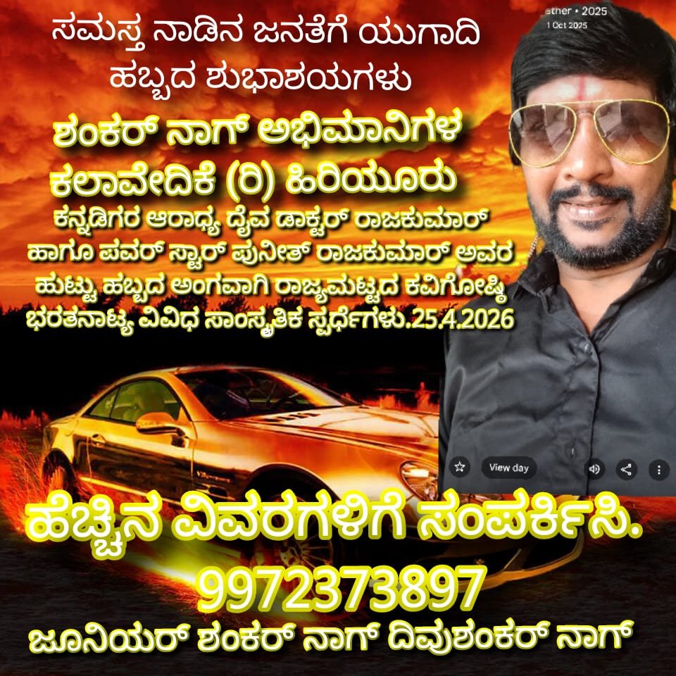 ನಗರದ ನೆಹರು ಮೈದಾನದಲ್ಲಿ 2026ಏಪ್ರಿಲ್ 25, ರಂದು ಶನಿವಾರ ಬೆಳಿಗ್ಗೆ 10 ಗಂಟೆಗೆ ಕನ್ನಡಿಗರ ಆರಾಧ್ಯ ದೈವ ಡಾ. ರಾಜಕುಮಾರ್ ಅವರ 97ನೇ ವರ್ಷದ ಜನ್ಮ ದಿನಾಚರಣೆ ಹಾಗೂ ಪವರ್ ಸ್ಟಾರ್ ಡಾ. ಪುನೀತ್ ರಾಜಕುಮಾರ್ ಅವರ 51ನೇ ವರ್ಷದ ಹುಟ್ಟುಹಬ್ಬದ ಅಂಗವಾಗಿ ಶಂಕರ್ ನಾಗ್ ಅಭಿಮಾನಿಗಳ ಕಲಾವೇದಿಕೆ ವತಿಯಿಂದ ರಾಜ್ಯ ಮಟ್ಟದ ಸಾಂಸ್ಕೃತಿಕ ಕಾರ್ಯಕ್ರಮವನ್ನು ಆಯೋಜಿಸಲಾಗಿದೆ ಎಂಬುದಾಗಿ ಕಾರ್ಯಕ್ರಮದ ಆಯೋಜಕರು ತಿಳಿಸಿದ್ದಾರೆ.