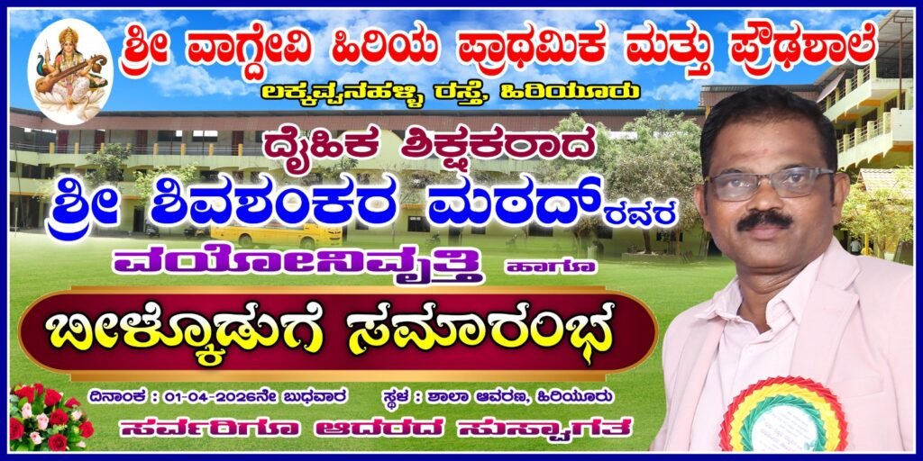 ನಗರದ ವಾಗ್ದೇವಿ ವಿದ್ಯಾಸಂಸ್ಥೆಯ ಆವರಣದಲ್ಲಿ ಎಪ್ರಿಲ್ 1 ರ ಬುಧವಾರದಂದು ವಾಗ್ದೇವಿ ಪ್ರಾಥಮಿಕ ಹಾಗೂ ಪ್ರೌಢಶಾಲೆಯ ದೈಹಿಕ ಶಿಕ್ಷಕರಾದ ಶಿವಶಂಕರ್ ಮಠದ್ ರವರ ವಯೋನಿವೃತ್ತಿ ಹಾಗೂ ಬೀಳ್ಕೊಡುಗೆ ಸಮಾರಂಭವನ್ನು ಹಮ್ಮಿಕೊಳ್ಳಲಾಗಿದೆ ಎಂಬುದಾಗಿ ವಾಗ್ದೇವಿ ವಿದ್ಯಾಸಂಸ್ಥೆಯ ಅಧ್ಯಕ್ಷರಾದ ಕೆ.ವಿ.ಅಮರೇಶ್ ತಿಳಿಸಿದ್ದಾರೆ.
