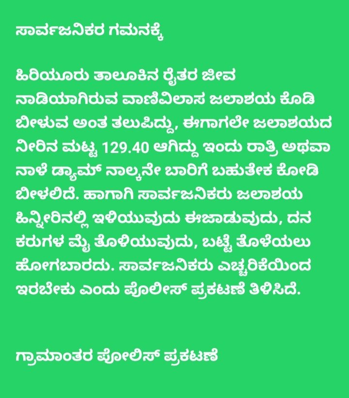 ಆದ್ದರಿಂದ ಸಾರ್ವಜನಿಕರು ವಾಣಿವಿಲಾಸಸಾಗರ ಜಲಾಶಯದ ಹಿನ್ನೀರಿನಲ್ಲಿ ಇಳಿಯುವುದು, ಈಜಾಡುವುದು, ದನಕರುಗಳ ಮೈ ತೊಳೆಯುವುದು, ಬಟ್ಟೆ ತೊಳೆಯಲು ಹೋಗಬಾರದು ಸಾರ್ವಜನಿಕರು ಎಚ್ಚರಿಕೆಯಿಂದ ಇರಬೇಕು ಎಂಬುದಾಗಿ ಪೊಲೀಸ್ ಇಲಾಖೆ ಪ್ರಕಟಣೆಯಲ್ಲಿ ತಿಳಿಸಲಾಗಿದೆ.